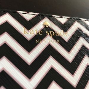 Kate Spade Lacey wallet in a black, white & lavender zig zag pattern. 12 card slot, two flat bill fold slots on either side, three open compartments, one zippered coin pocket & one flat pocket on back. Zipper all around.
