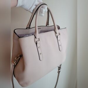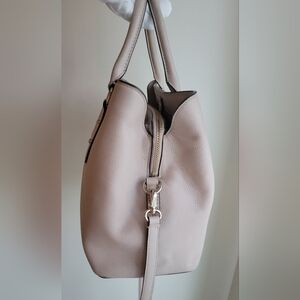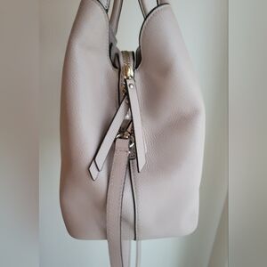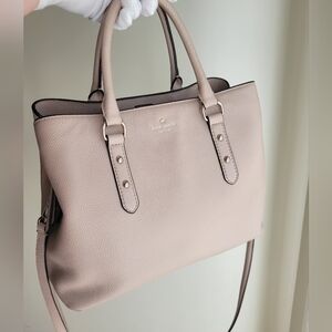 Kate Spade Larchmont Avenue Evangelie Satchel in Taupe.Gorgeous pebbled leather.Measures 9.2x11.7x5.3.Looks lighter taupe in natural lighting. Preloved.You can wear as a hand tote or crossbody.Only worn a few times and in excellent condition.A little rubbing on handle and bottom,scratches on feet,and a small spot on the side by the zipper..all hardly noticeable.This purse has been professionally cleaned and leather moisturized.Includes crossbody strap. Simply gorgeous.