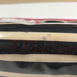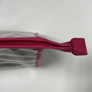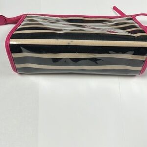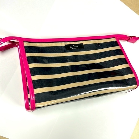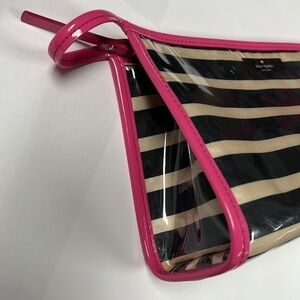 This is a beautiful Kate Spade Large Heddy Thalia Striped Glazed Clutch Bag. Beige and black horizontal stripe satin covers in plastic soft lucite to protect from water or elements. Pink patent leather like trim and zipper. Goldtone hardware. Lining does show some spotting from makeup. Overall in very good condition. No odors. No tears. 9.5” x 5.75” x 3”