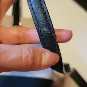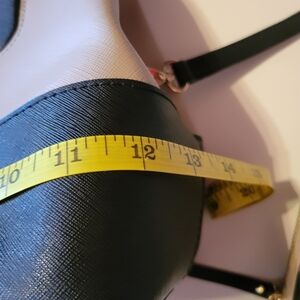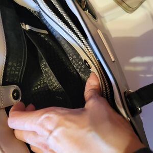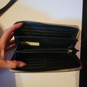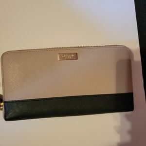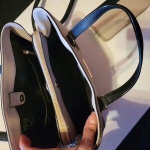 EUC Kate Spade Laurel Two Tone bag in black and taupe color. It is very roomy with 3 compartments. It comes with a matching wallet and shoulder strap.The shoulder strap has a slight stain, but it is small and barely noticeable. See pic 6.