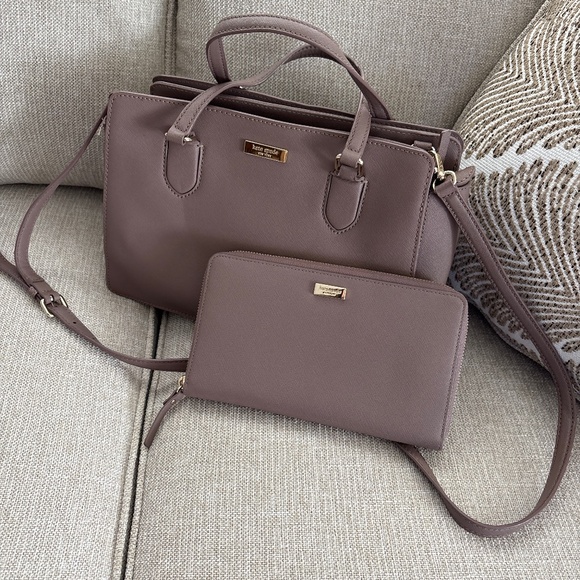 Mauve colored Fray on one side of bag Saffiano leather. 14-karat light gold plated hardware and protective metal feet. Fabric lining. Center zip closure compartment with zip and slip pockets. Front and back snap closure compartments. Double handles drop 4.6. Measures :height 8.3 length 12.5 depth 4.5 100% Authentic