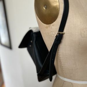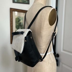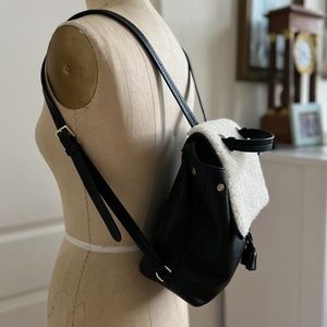 This backpack is pebbled black leather with a shearling flap. The straps are adjustable. Perfect for any outing!!