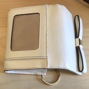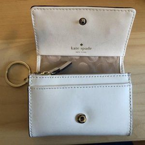 Kate Spade white leather compact wallet with tonal stitching, gold-tone hardware, woven logo interior lining, bow adornment at front panel and snap closure.