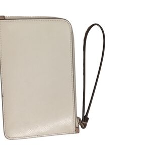Crafted from saffiano genuine tan leather—durable yet elegant, with subtle gold‑tone hardware highlighting the zipper and logo with wrist strap for sleek design.