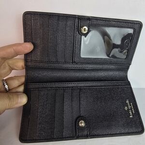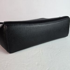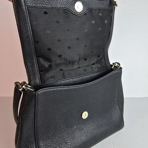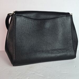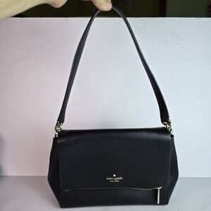 Kate Spade Leila Black Pebbled Leather Flap Shoulder Bag Extra Crossbody Strap. Discover the elegance of the Kate Spade black shoulder bag, crafted with premium leather for a timeless look. Its minimalist design and high-quality materials make it a versatile accessory for any occasion. Elevate your style with this sophisticated and practical bag. Pebbled leather KSNY metal pinmount logo Zip pocket at Flap flap with magnetic snap closure Signature two way spade jacquard lining interior zip and slip pockets exterior pocket back with magnetic snap button closure. gold hardware. Top Shoulder Strap handle drop: 9.5" Detachable and Adjustable Crossbody Shoulder Strap drop: 22" Medium Size: 8"h x 12.25"w x 4.5"d. There is a faint blue mark on the front flap. I showed it in the 2nd and 3rd picture. Excellent used condition. Very clean. Comes with matching wallet.