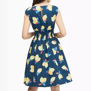 Kate Spade chic and vibrant sleeveless, boat neckline, a-line silhouette, blue with a playful lemon print. Detailed with a smocked waist with pockets. In very good condition with normal wear with no snags. 100% cotton with cotton lining. Size 8
