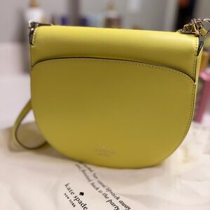 Vibrant lemon crossbody bag. Heart-shaped clasp. Elegant chain strap.