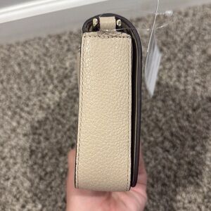This Kate Spade crossbody bag showcases a sophisticated tan and white color-block design, perfect for adding a touch of elegance to any outfit. Crafted from textured leather, it features a structured silhouette and a convenient crossbody strap for hands-free wear. The minimalist aesthetic and neutral tones make it a versatile accessory for various occasions.