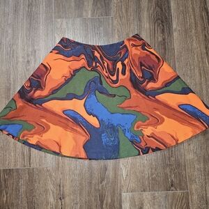 Add a bold statement to your wardrobe with this Kate Spade Let Loose! A-line mini skirt featuring a stunning abstract swirl print in rich fall tones of orange, blue, green, and burgundy. Crafted from 100% cotton, this high-quality skirt is structured yet breathable, offering both style and comfort. It features a hidden back zipper closure and a flattering fit-and-flare silhouette. A perfect piece to style with boots, tights, or a sleek black top for a chic, artistic look.