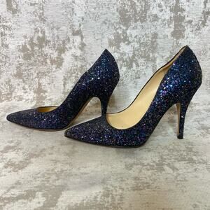 Gorgeous heels from Kate Spade! Features pointed toe, stiletto heel, leather interior, leather sole, style named "Licorice", and exterior and heel fully covered in deep navy blue glitter.