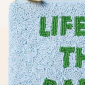 Keywords: Kate Spade, Life of the Party, Beaded Pouch, Clutch, Bag, Evening Bag, Party Clutch, Small Bag, Accessory, Blue Pouch, Green Lettering, Designer Bag