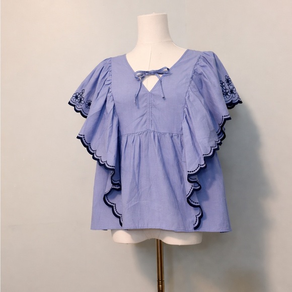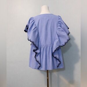 Charming light blue blouse with ruffle sleeves. Features delicate embroidery and a bow tie detail.