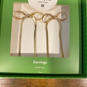 Gold Bow linear stud drop earrings feature brass nickel free material design.