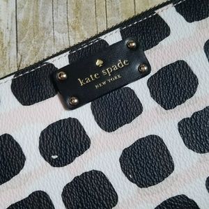 NWT Beautiful black, white, and pink lines and boxes Kate Spade full size wallet. Zip closure all around, six credit card slots on each side, and middle coin holder with zip closure. Black lining.