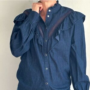 Kate Spade • Long Sleeve Ruffle Blouse in Dark Blue Chambray