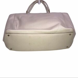 Kate Spade tote crafted in rich 100% leather. Has zipper top closure. Has front exterior pocket with magnetic closure. 1 interior zip pocket and 2 slip pockets. Has some staining throughout exterior, shown on pictures but still has lots of wear life left. Color is a beige / tan / cream color
