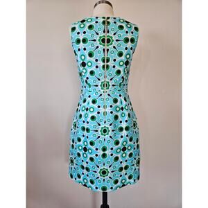 Sheath dress with gorgeous geometric design. Gold back zipper with decorative pull. Back slit, jewel neckline, fully lined, sleeveless, short, mid-thigh length.