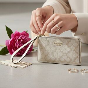This beautiful Kate Spade Lucy Wristlet is the ultimate compact accessory for when you want to travel light. Crafted in the signature Spade Flower Coated Canvas—which is both stylish and wonderfully easy to maintain—it keeps your essentials secure without the bulk of a full-sized wallet.