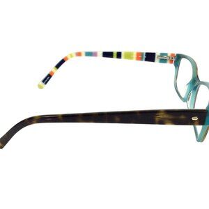 Stylish rectangular eyeglasses featuring a tortoise frame with multicolor temples. Comes with a branded protective case.