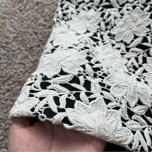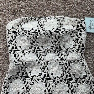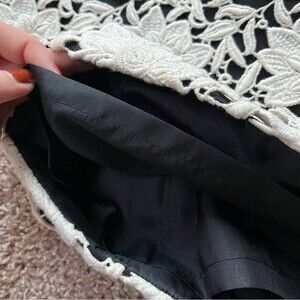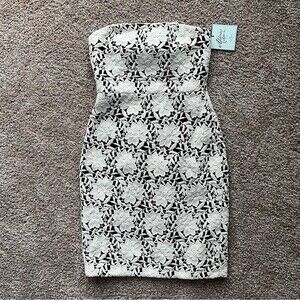 Kate Spade Daxen Dress from the Madison Avenue collection. White floral lace over black under layer. Strapless. Gold shiny zipper on back. So stunning for the holidays! Originally $998. There is a section of white lace around the hem that has what appears to be a makeup stain (pictured to the best of my ability). Size 4