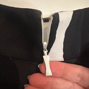 Make a bold statement with this striking black and white A-line midi skirt, perfect for adding a pop of graphic elegance to any occasion.