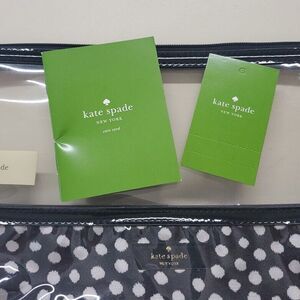 New with tags! Kate Spade New York cosmetic bag with black and white polka dots. Made with clear vinyl so you can use it for TSA screening. The bag has a zippered top and is water resistant. Original retail price is $69. Great holiday gift!