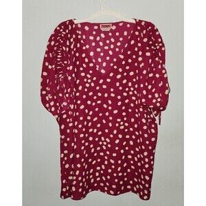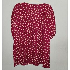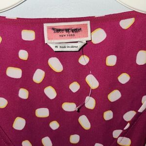 Elevate your wardrobe with this stunning Kate Spade New York blouse in a beautiful berry and white mallow dot print. This top features short sleeves with cinched detailing and a flattering v-neckline. The sleeves are cinched adding a touch of elegance to the blouse. Made of high-quality polyester material, this blouse is perfect for any occasion. The size of this blouse is medium and it is suitable for regular sized women. This blouse is perfect for any fashion-forward individual looking for a stylish and comfortable addition to their wardrobe.