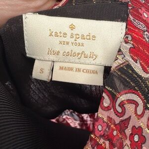 This Kate Spade Medallion Metallic Silk Blouse in size small is a lightweight and sheer top perfect for various occasions such as travel, parties, formal events, and business meetings. The blouse features a round neckline, long bell sleeves, and ruffle accents, giving it a stylish and feminine look. Made with chiffon fabric and accented with pleats and bows, this blouse is a limited edition piece that is ideal for the summer, fall, and spring seasons. With a black and red color and floral pattern, this blouse is a versatile and chic addition to any woman's wardrobe, embodying a mix of art, flower, colorful, and whimsical themes.