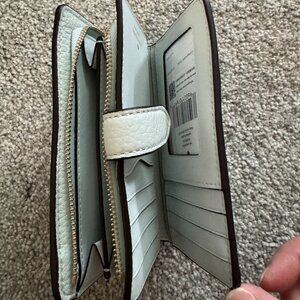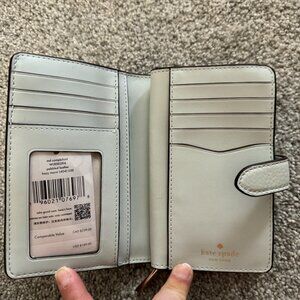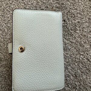 This is a medium compact bifold wallet by Kate Spade in the color Hazy Morning in Pebbled Leather. It almost looks like a light seafoam green? Used only once or twice, is in perfect condition. The only thing I can see on it is a small, slightly dark spot on the front. It's on the right side, about halfway down and is shown in the first picture.