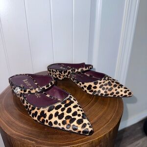 These like-new stylish flats from Kate Spade feature a chic leopard print in brown and black, offering a versatile and fashionable look. With a comfortable flat design and a pointed toe, they are perfect for casual outings. The backless mule style adds a modern touch to these classic flats.