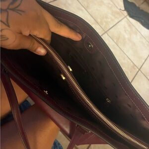 Stylish burgundy bag and wallet set by Kate Spade. Sleek design with gold accents. Ideal for modern elegance.