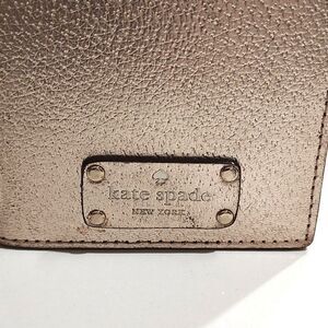 Kate Spade Metallic Rose Gold Leather Passport Holder Card Wallet. Kate Spade Logo leather patch on the front cover and a gold logo stamped on the inside. The interior has 7 card slots on the left, and the passport holder on the right.