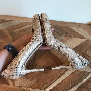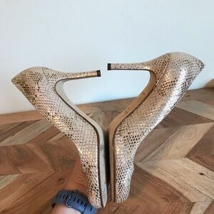 Features: gorgeous metallic gold heeled pumps, embossed snake skin design, round toe, narrow heels.