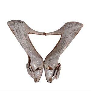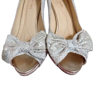Kate Spade Metallic Snakeskin Bow Heels Cream And Silver Peep Toe Pumps Sz 6.5