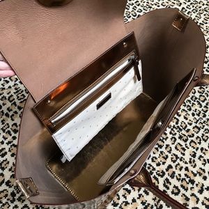Kate Spade Metallic tote. The color is a metallic bronze. This tote is larger in size and in perfect condition, with the exception of minor stain on interior pocket (pictured)