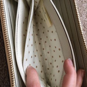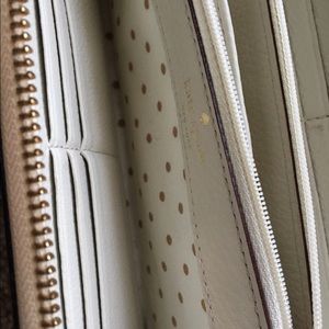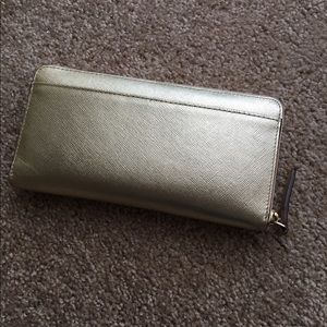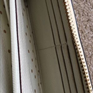 Used condition. Signs of wear on the outside corners and around the zipper, one inside zip pocket is dirty from coins and very slight scratches to the outside leather; common with the gold leather. Fabric lining. Zipper closure. 4"H x 8"W.