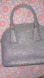The material of this bag has a slight glitter texture. It is a dark silver color in person. There is one bigger exterior slip pocket with magnetic closure. Inside the zipper pocket is one slip pocket with button closure and also 3 card slots. Comes with adjustable crossbody strap. Gold hardware. Like new condition, only used a couple of times.