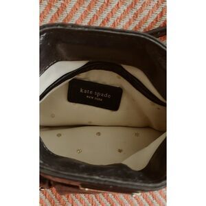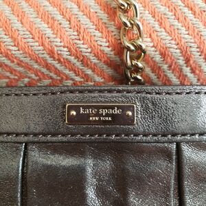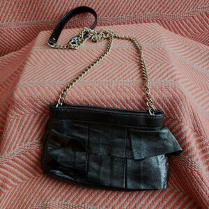 Beautiful metallic pewter purse with wide ruffle detail. In mini size 8" wide, 5" tall, 2.5" at opening when extended out. Chain and leather strap. The interior of purse features two small compartments, with enough room for a compact, lipstick, and keys. Interior is clean, with attached patent Kate Spade tag. Good condition.
