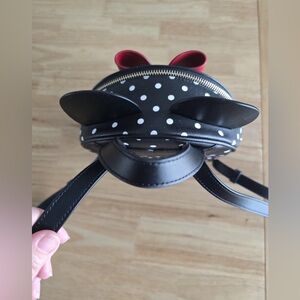 Adorable Kate Spade backpack. Features black and white polka dots. Highlighted by a bold red bow. Perfect for playful style.