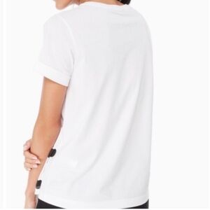 This stylish tee from Kate Spade features a playful red velvet polka dots and black polka dots on a crisp white background. The short sleeves and classic crew neckline offer a comfortable fit, making it perfect for casual outings. The design is both chic and versatile, ideal for adding a touch of fun to your wardrobe.