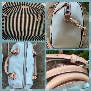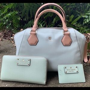 This is a preowned Kate Spade mint green bag, wallet, and card ID. The accessories are NOT a perfect color match, so the purse can be separated for individual purchase (same color, different grains).