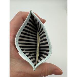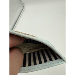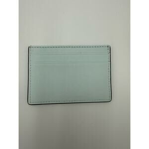 This is a Kate Spade thin slim credit card holder wallet. Light minty color. Looks like a minty green or super light sea blue...hard to tell the color. Has the black and white stripes inside. This appears to be brand new. The inner tag is kind of wrinkled but the wallet itself looks like it is brand new like it has never been used...