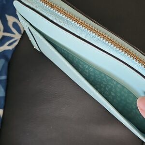 Mint green wallet by Kate Spade. Adorned with silver studs and logo plate. EUC.