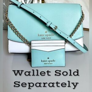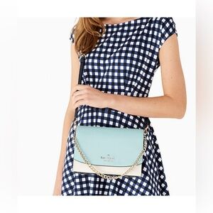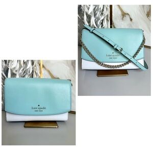 Stylish mint and white crossbody bag. Features a chic chain strap. Perfect for any occasion.