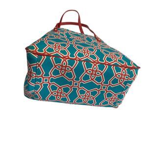 Turquoise & flame ( teal & red) coated canvas Kate Spade New York Michelle Moroccan Market Tote with gold-tone hardware, patent leather trim, dual flat shoulder straps, four interior wall pockets; one with zip closure and snap closure at top