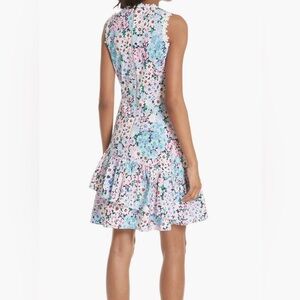Chic mini dress with vibrant floral pattern. Features a playful ruffled hem. Ideal for casual outings. Used in very good used condition.