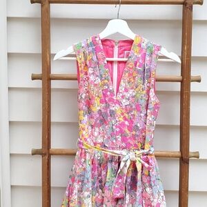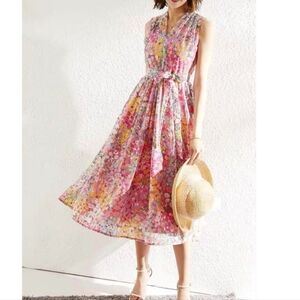 Vibrant floral print. Sleeveless design. Flattering midi length. Perfect for any occasion.