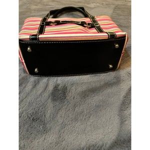 This is a multicolor handbag/mini tote w/ silver feet and black leather straps. Cute yellow polka dot fabric interior w/ 1 inside zipper pocket. No matching crossbody strap, but there are rings where you could clip any strap or chain! Small mark on side (pic 8) and one strap is missing a few stitches (pic 7). 11" wide, 7" tall, 4" across bottom. 1/2 strap is 7"