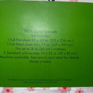 This Full Size Sheet set includes: 1 flat sheet 85” x 101”, 1 fitted sheet 54” x 75” fits up to 18" mattress), and 2 standard pillowcases 20" x 32". Known for its quality as well as its popularity Kate Spade bedding is one of a kind. These sheets are made of 100% cotton percale, which is the most breathable fabric you can sleep on/in.