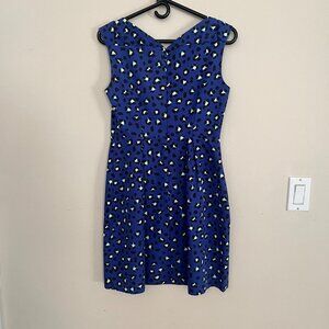 Fun animal print on a blue background. Zip up back. Fit and flare flirty dress.